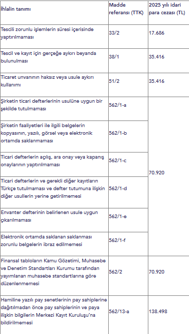 Tabloda belirtilen ceza tutarları 01 Ocak 2025 ile 31 Aralık 2025 tarihleri arasında geçerli idari para cezalarını göstermekte olup, ilgili tutarlar her yıl yeniden değerleme oranına göre güncellenecektir. TTK kapsamındaki bu yükümlülüklere uyumun titizlikle sağlanması idari para cezalarının uygulanmasını önlemek adına önem arz etmektedir.