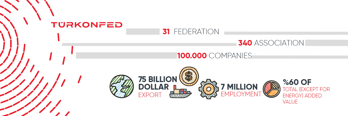 TÜRKONFED (Turkish Business Confederation) is a non-governmental and nonpartisan business organization, aiming to contribute to the development of regional, sectoral and national economic policies. TURKONFED was established in 2004 as a nation-wide confederation, representing 6 federations and 69 associations. Today, TURKONFED represents 31 federations and 340 associations with nearly 100 thousand company as members. TURKONFED is member of SMEunited, which is the association of crafts and SMEs in Europe representing over 22 million SMEs from 30 European countries. In this respect TURKONFED is a bridge between the Turkish business world and the European Union. In addition, TURKONFED has members from across the globe that gather under the platform TURKONFED International.