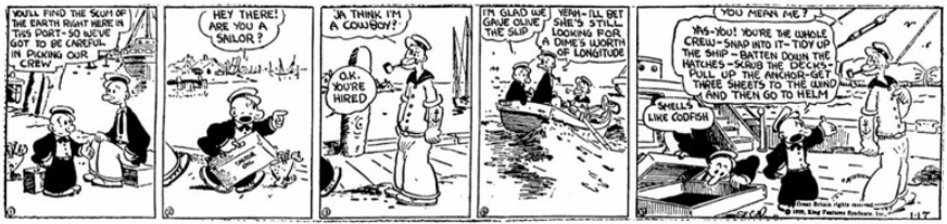Ülkemizde Temel Reis adıyla bilinen Popeye, ilk kez 17 Ocak 1929 tarihinde karikatürist E.C. Segar’ın “Thimble Theatre” adlı çizgi romanının “Gobs of Work” hikayesinde yan karakter olarak yer almış ve daha sonra Safinaz adıyla tanıyıp sevdiğimiz Olive Oyl’ı sevgilisi “Kabasakal” (Ham Gravy)’den ayırıp, onun yerine bir ana karakter olarak belirmeye başlamıştır. İşte Temel Reis’in yayınlanmasından 95 yıl sonra kamuya mal olan versiyonu, bu anılan karikatürde yer alan ilk halidir.